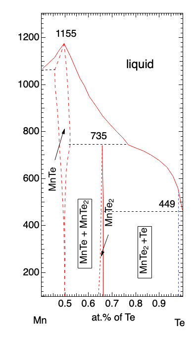 Mn-Te binary 시스템의 phase diagram 이다. Mn이 과다한 시스템의 경우, 다양한 구조와 조성비가 매우 복잡하게 나타난다. 여기서는 Te과다 시스템에 대한 phase diagram만 요약하여 정리한 것이다. MnTe phase diagram에서 특이한 사항은 Mn과 Te의 조성비에 따라서, MnTe, MnTe+MnTe2 혼합, MnTe2, MnTe2 +Te 의 다양한 형태로 합성이 된다. Mn은 산소와의 반응도가 매우 높아, 고온에서 석영관을 이용해 합성할 경우, 석영이 SiO 혹은 Si의 형태로 변형이 되어 석영관이 파손되는 경우가 빈번하다. 이러한 이유로 MnTe는 주로 고순도 탄소봉을 이용해 합성을 해야한다.