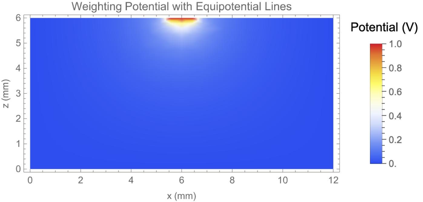 Weighting potential in hemi-spherical detector is calculated using Mathematica with FEM. Detector configuration is 12x12x6 mm3. Five surfaces except top are fully covered with gold electrode (cathode) and center of top surface has a 1-mm diameter elctrode (anode). Potential in cathode and anode is 0 V and 1 V, respectively.