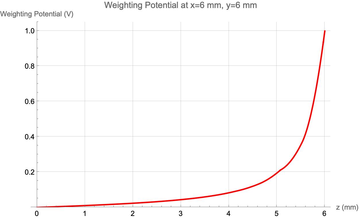 Weighting potential along the z-axis for 0.5-mm diameter anode. The shape of weighting potential depends on the size of anode. As the anode size gets smaller, the potential slope gets steeper.