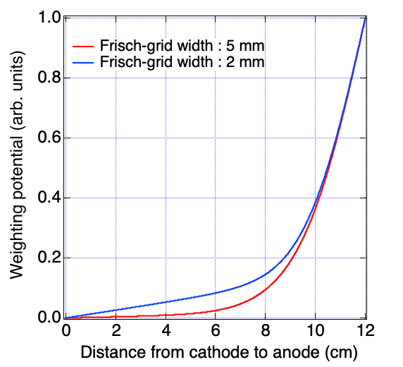 The width of Frisch-grid affects on the steepness of weighting potential. Weighting potential becomes steeper as the width of Frisch-grid wider.