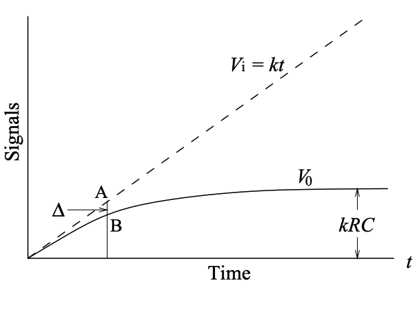 Any real pulse rises from zero to its peak in a finite time Tr and there will be a difference between the output and input depending on the ratio of τ to Tr. This difference is called the ballistic deficit (shown as ∆ in Figure). If τ > 5×Tr , ∆ < 1% of the signal height.