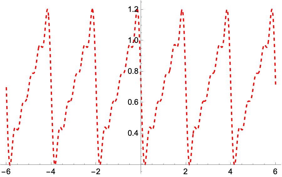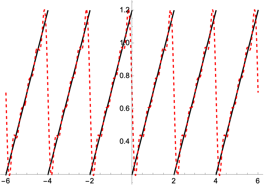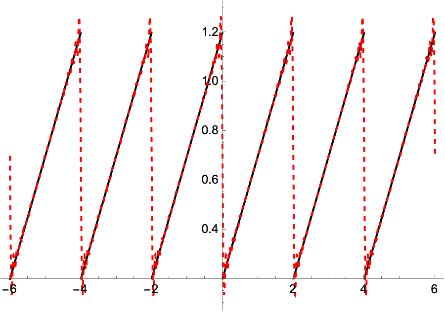 이 함수는 매스매티카에서 SawtoothWave[t/2] + 0.2 로 함수를 표현할 수 있다. 5번째 항까지의 푸리에 급수는 다음과 같이 구할 수 있다. 이 함수를 그래프로 그리려면 다음과 같이 실행하면 된다.