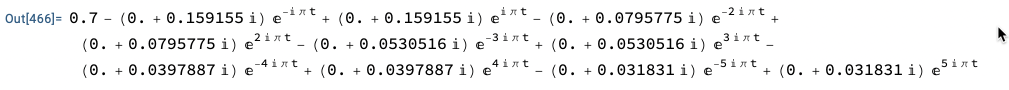 그리고, 푸리에 급수는 매스매티카의 내장 명령인 FourierSeries 을 이용해 다음과 같이 구할 수 있다. 아래의 예는 5번째항 까지를 구하라는 명령어이다.