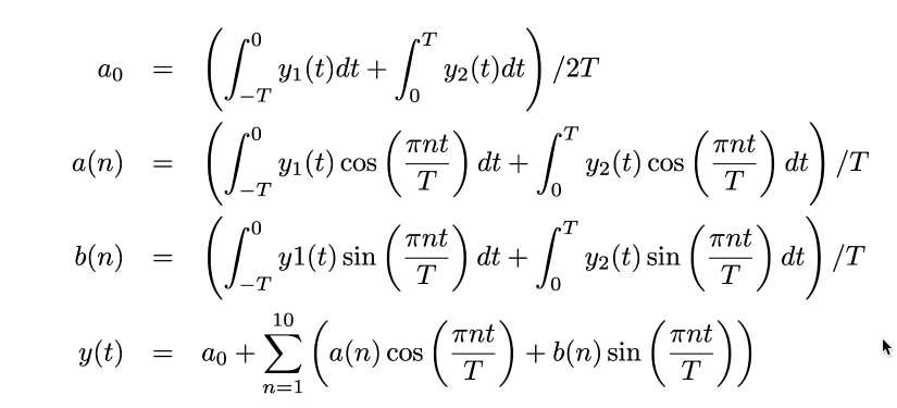 y[t_]:= a0 + Sum[a[n] * Cos[(n*Pi*t)/T] + b[n]*Sin[(n*Pi*t)/T], {n,0,20} ] (*sum over 20th terms*)