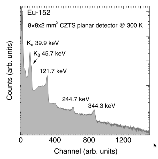 Pulse height spectra of Eu-152 taken with planar CdZnTeSe detector. All the gamma peaks of Eu-152 lower than 344 keV are clearly visible. The interaction probability of photon which higher thatn 344 keV is nearly zero, thus higher energy gamma peaks than 344 keV are not detectable.