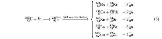 Decay chain을 LaTeX로 표현하기 \usepackage{amssymb, amsmath} \usepackage{mhchem} % 해당 패키지를 사용해야 한다. \begin{equation} \ce{^{235}_{92}U + ^{1}_{0}n -> ^{236}_{92}U^{*} ->[\text{85\% nuclear fission}]} \begin{cases} \begin{align*} \ce{^{144}_{56}Ba &+ ^{89}_{36}Kr &+ 3^{1}_{0}n} \\ \ce{^{144}_{55}Cs &+ ^{90}_{37}Rb &+ 2^{1}_{0}n} \\ \ce{^{140}_{54}Xe &+ ^{94}_{38}Sr &+ 2^{1}_{0}n} \\ \ce{^{146}_{57}La &+ ^{87}_{35}Br &+ 3^{1}_{0.. LaTeX 2022.03.25