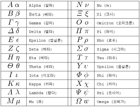 LaTeX 기호 모음 LaTeX 사용한지 오래되면, 대부분의 문자 표현식을 기억하고 있지만, 가끔씩 생각이 나지 않을때를 대비해 자주 쓰는 기호를 모아보았다. 1. 그리스 문자 α \alpha β \beta γ \gamma δ \delta ϵ \epsilon ζ \zeta η \eta θ \theta ι \iota κ \kappa λ \lambda μ \mu ν \nu ξ \xi o o (omicron) π \pi ρ \rho σ \sigma τ \tau υ \upsilon ϕ \phi χ \chi ψ \psi ω \omega ε \varepsilon ϑ \vartheta ϰ \varkappa ϖ \varpi ϱ \varrho φ \varphi ς \varsigma A A (Alpha) B B (Beta) Γ \Gamma Δ.. LaTeX 2022.09.28