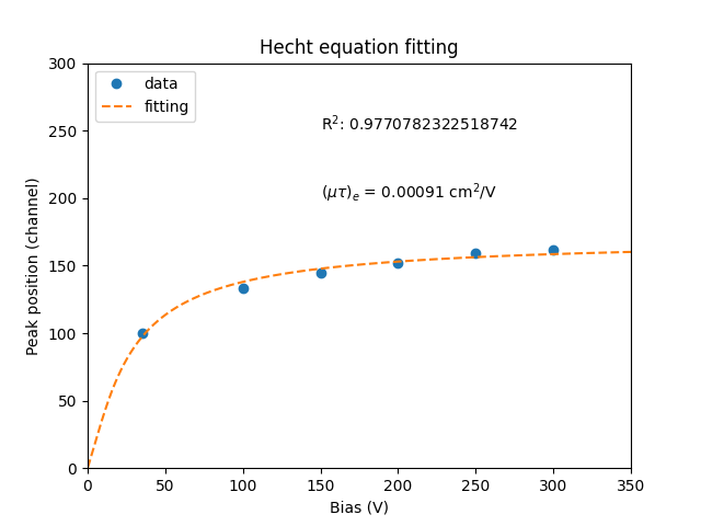 운반자의 이동도와 수명의 곱을 계산하기 위한 파이썬 프로그래밍의 예제이다. import matplotlib import matplotlib.pyplot as plt from matplotlib import style from matplotlib import pylab import numpy as np from scipy.optimize import curve_fit # bias data and peak position channel data xs=np.array([35,100,150,200,250,300]) ys=np.array([100,133,145,152,159,162]) #detector thickness in cm. det_thick=0.2 #define fitting function def ex..